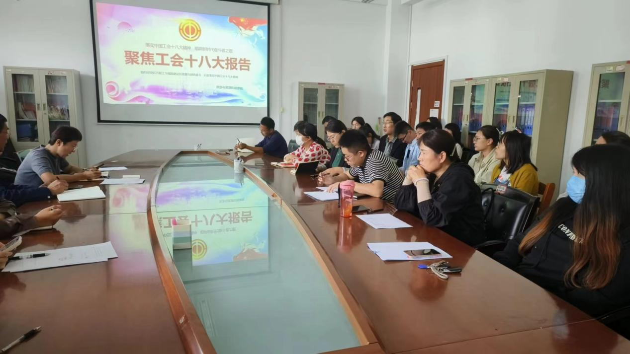 10月18日下午,beat365在线唯一官网在豁然楼A411会议组织全体教职工传达学习中国工会十八大精神。学院党总支副书记、工会主席韩建敏主持会议并对传达蔡奇同志代表党中央在中国工会十八大上的致词和王东明同志在大会上所作的报告。