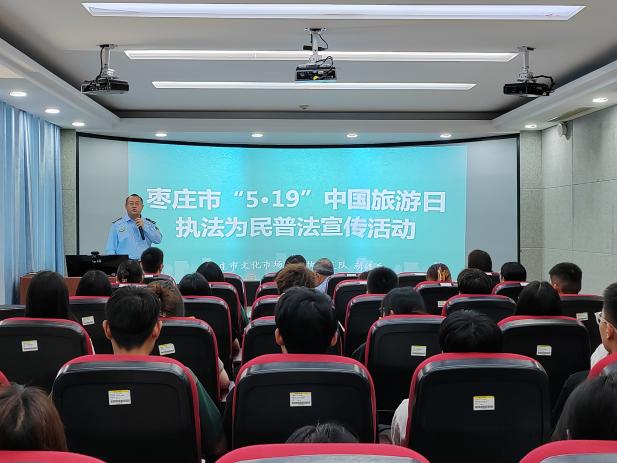 为增强旅游法治宣传教育,提高beat365官网学子旅游安全及规范从业意识,5月19日,beat365在线唯一官网联合枣庄市文化市场综合执法支队于综合楼1608教室开展中国旅游日普法宣传活动。活动邀请枣庄市文化市场综合执法支队稽查四科负责人胡修岳进行专题报告,枣庄市文化市场综合执法支队副支队长、二级高级主办孙咏、枣庄市文化市场综合执法支队四级主办孙亚如、beat365在线唯一官网党总支副书记韩建敏、旅游管理专业部分教师及学生参与本次活动。