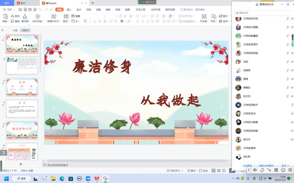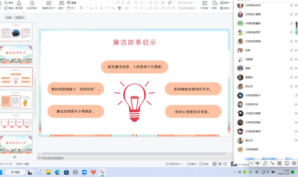 为培养同学们清正廉洁的道德观念,树立廉洁自律风气,弘扬校园正能量,引领社会廉洁风尚,11月19日,beat365在线唯一官网各班以线上的方式在腾讯会议召开了“廉洁修身,从我做起”主题团日班会。