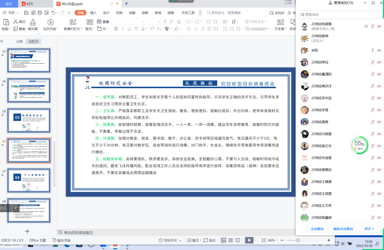 会议伊始,主持人对现在严峻复杂的疫情防控形势进行讲述,并提醒同学们要做到不聚集,少聚集,保持一定的社交距离,定期做好卫生清洁消毒,在课余时间养成健康生活方式。主持人强调,应响应国家要求,做到核酸应检尽检,积极听从并遵守上级对防疫工作的安排;要加强自身心理建设,保持乐观,学会调控情绪。主持人与同学们共同探讨个人疫情防护的方法及措施,增强了同学们的个人防护意识,加深同学们对当前疫情的认识,使同学们更有序的融入到疫情防控工作中去。