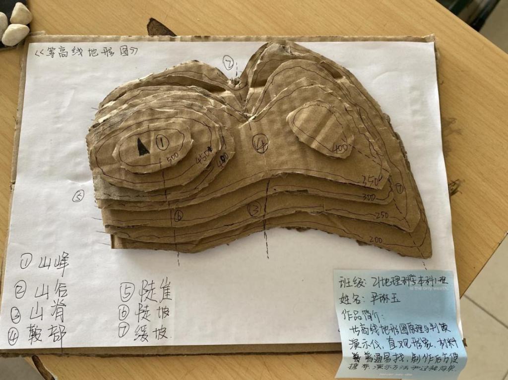 大赛伊始,参赛人员展示参赛作品,作品内容多样,有分层设色地形图、立体模型、原理演示图等,充分展示了同学们缜密思维和良好的动手能力。各位同学结合自己的作品,讲解教具使用方法,闸释其中的地理原理,也说明了制作过程中的困难和解决办法。同学思路清晰,语言规范准确。评委教师充分肯定了学生学习热情,表扬了学生们的动手能力。