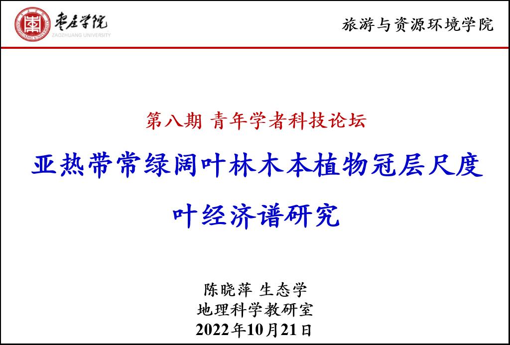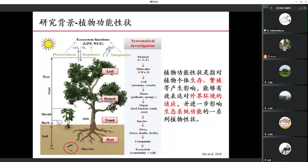 报告会上,陈晓萍博士结合近年来的研究成果,作了题为“亚热带常绿阔叶林木本植物冠层尺度叶经济谱研究”的学术报告,介绍了不同优势木本植物冠层外部阳生小枝和冠层底部阴生小枝的叶片形态、代谢和化学性状变异。研究发现,尽管在冠层内,叶片生理性状显著不同,但是在阳生叶和阴生叶中叶经济谱性状之间存在共同斜率。这些结果支持存在适用于阳生和阴生叶片的“普遍”的叶经济谱。此外,叶脉性状可以预测比叶重和氮含量,支持叶脉性状为叶经济谱的形成机制。这些结果不仅为更加精确研究和评价森林群落功能提供参考,而且对于预测未来气候变化对植物生态系统的影响有着重要意义。