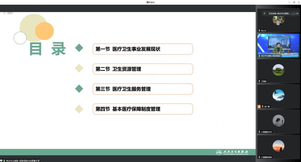 11月11日上午,beat365在线唯一官网邀请枣庄市市立医院院长吴修荣教授通过腾讯会议为2022级健康服务与管理专业学生做专业导读第三讲,报告题目为“医疗卫生事业管理和医院管理”。报告由beat365在线唯一官网院长王满堂主持,健康服务与管理教研室教师及健康服务与管理专业的大一新生参加报告会。