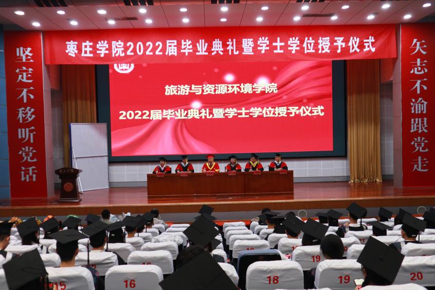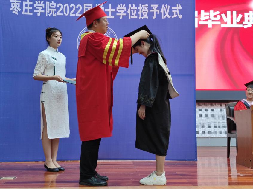 在庄严的国歌声中,学士学位授予仪式拉开序幕。仪式上,院长王满堂致辞,他对毕业生提出三点希望:一是要不断创新和进取,以拼搏奋斗应对挑战,赢得未来;二是要多与学校、学院联系,枣院的大门永远为同学们敞开;三是要心怀祖国,勇于肩负时代使命,投身于祖国建设之中。随后,副院长张大文宣读2022届本科毕业生学士学位授予名单。