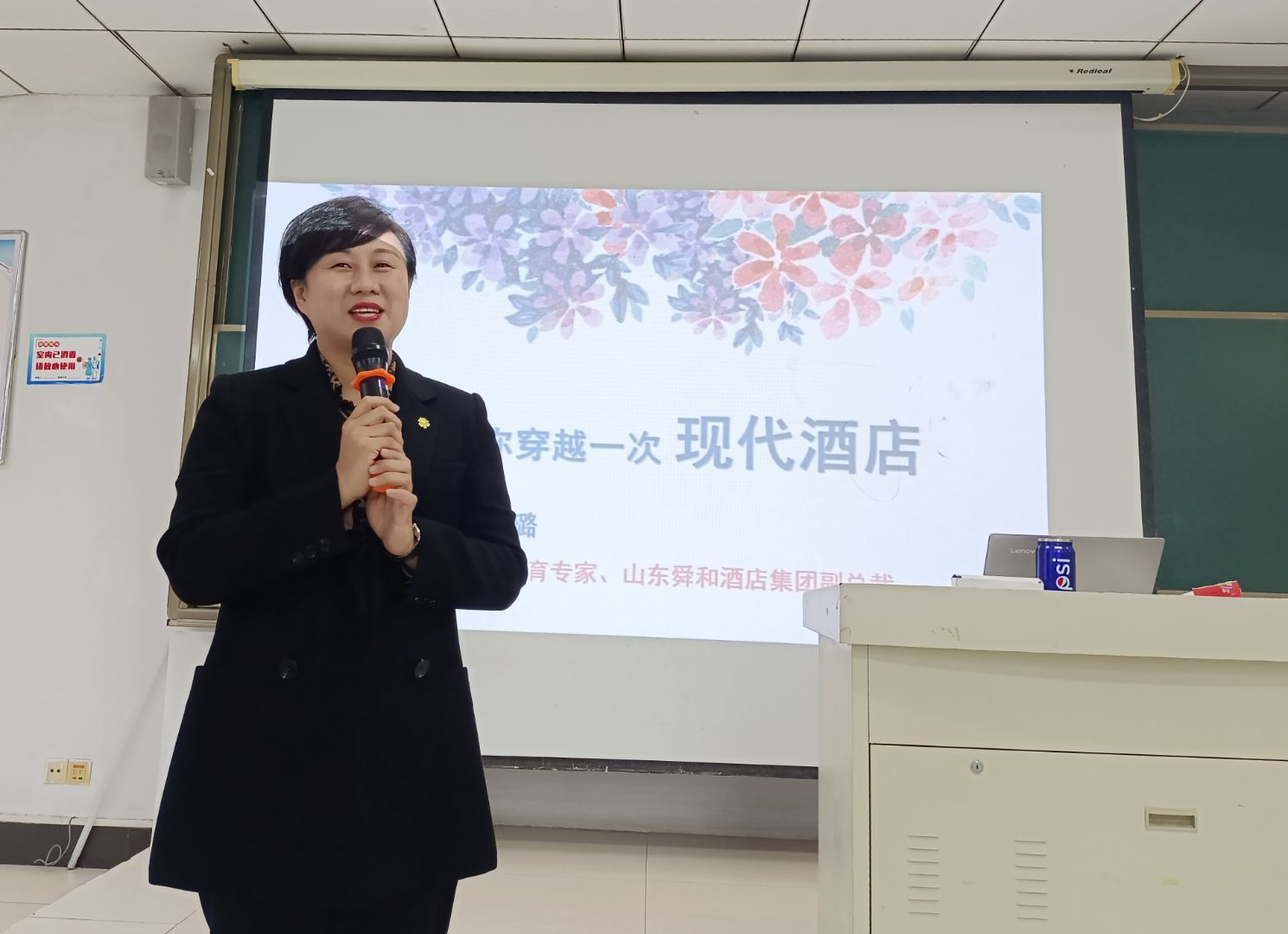 4月10日,beat365在线唯一官网邀请山东省旅游行业教育专家、舜和酒店集团副总裁白璐女士作题为《走,带你穿越一次现代酒店》的报告。旅游管理专业负责人孙倩蓉博士主持报告会,2022、2023旅游管理、酒店管理专业全体学生聆听了此次报告。