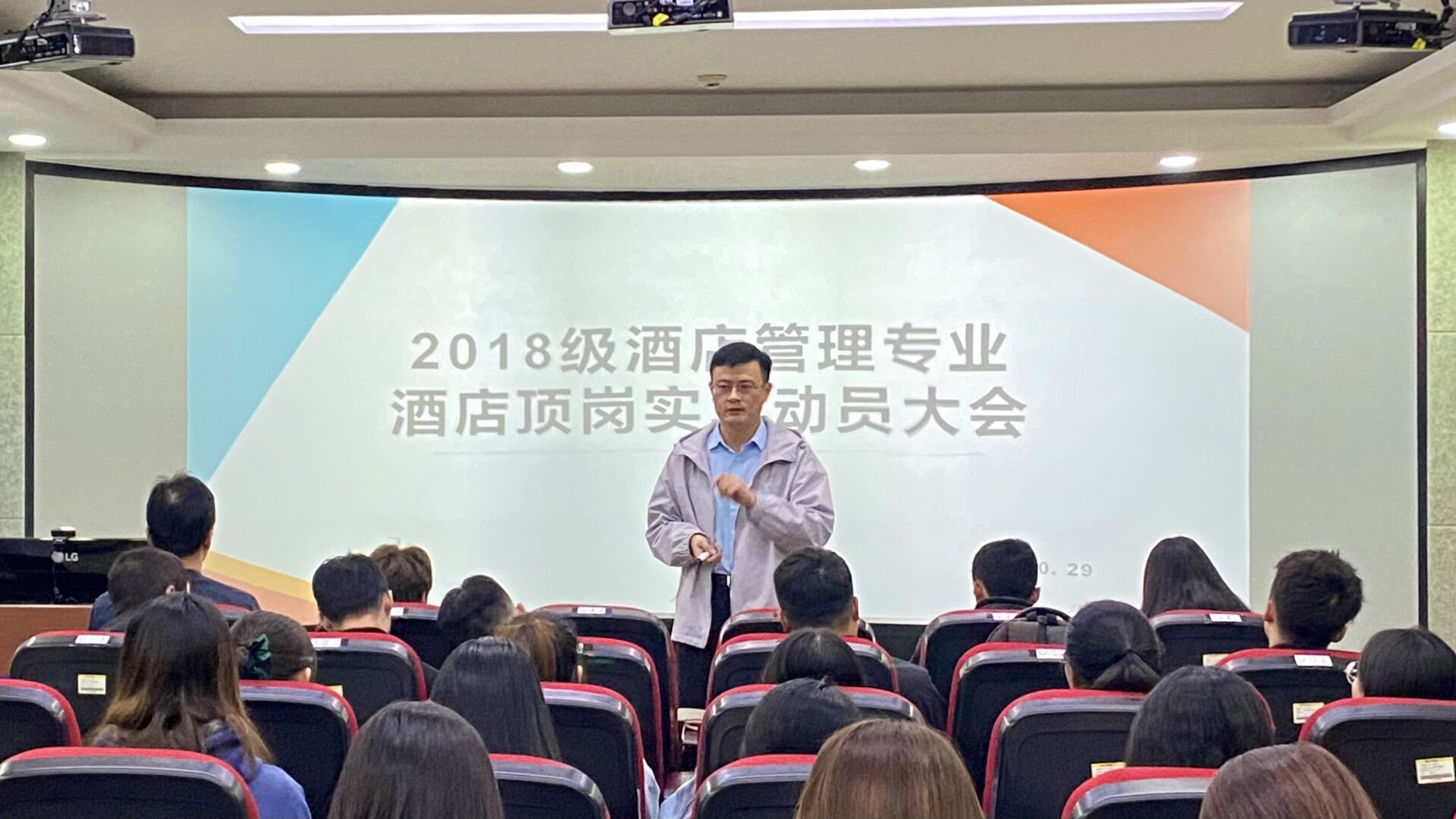 顶岗实习是应用型创新型人才培养体系中重要的教学环节,旨在提高大学生实践能力和创新能力,强化学生职业综合素养。为确保学生顶岗实习工作顺利开展,提高其对新环境、新岗位的适应能力,使同学们明确顶岗实习的重要性,10月29日下午beat365在线唯一官网在综合楼导游实训室召开2018级酒店管理专业顶岗实习动员会。beat365在线唯一官网部分教师、2018级酒店管理专业的辅导员及全体学生参加了此次会议,会议由专业负责人王文杰主持。