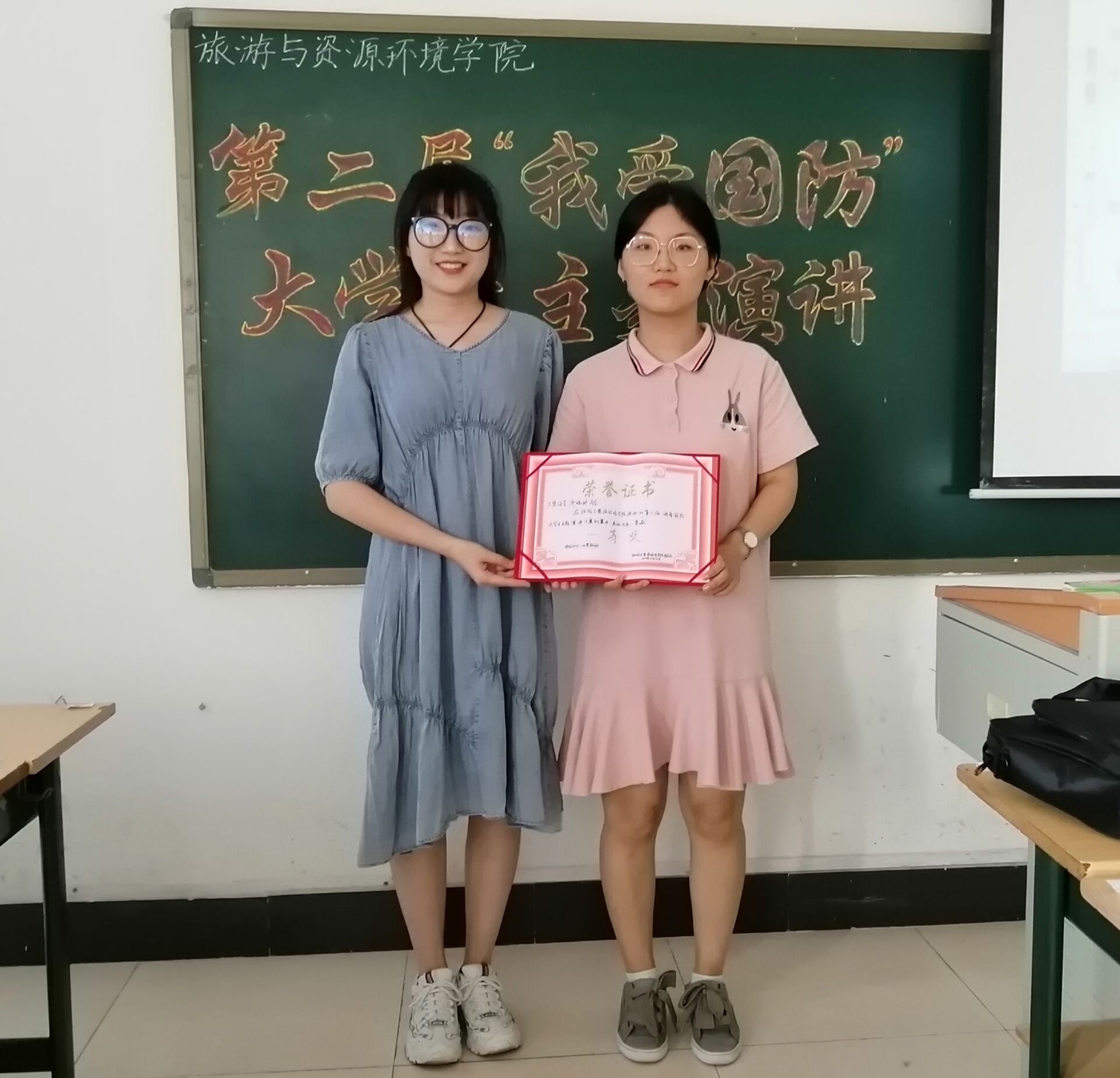 比赛中,参赛选手以“我爱国防”为主题,结合自身思想、学习情况和生活选取不同角度和方面进行演讲,或激昂慷慨,或娓娓动听,或妙语连珠,真切表达了当代大学生用青春报效祖国的使命情怀。她们富有激情、声情并茂的演讲获得台下观众的阵阵掌声。经过激烈角逐,19地理信息科学本科班的丁堃泳芳和齐晓婷获得冠军。