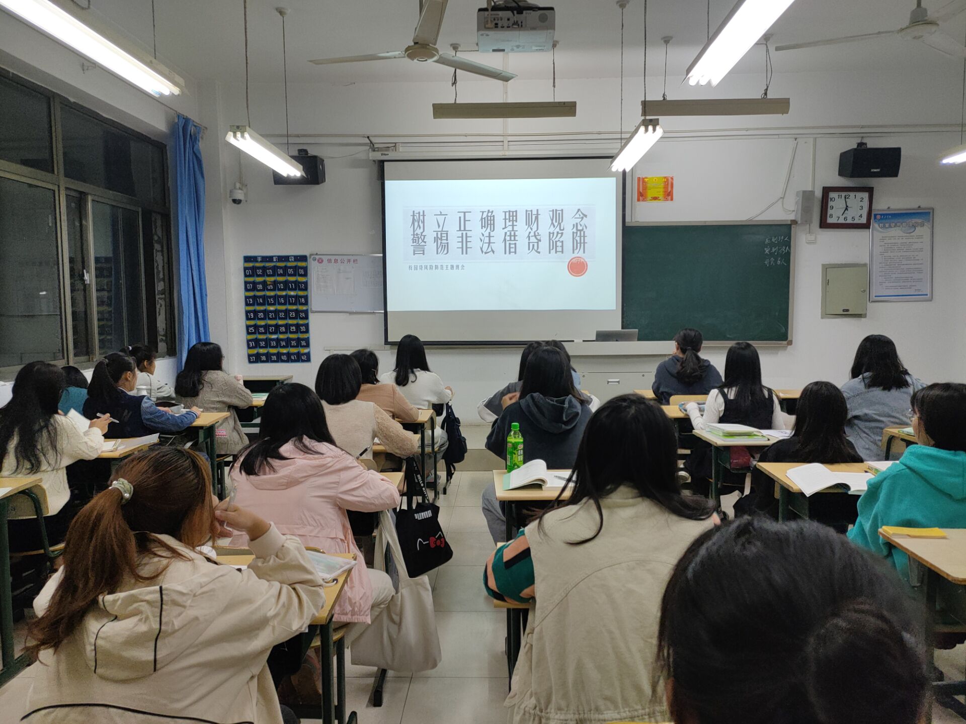 各班级积极开展校园贷风险防范专项活动,以校园贷的相关真实案例,从网络贷款的分类及其陷阱等方面,给同学们作了详细的讲解,同时组织观看校园网贷风险与危害的新闻视频,强调校园网贷问题不可轻视,让同学们了解到网贷的危害性,引发同学们的关注和思考。