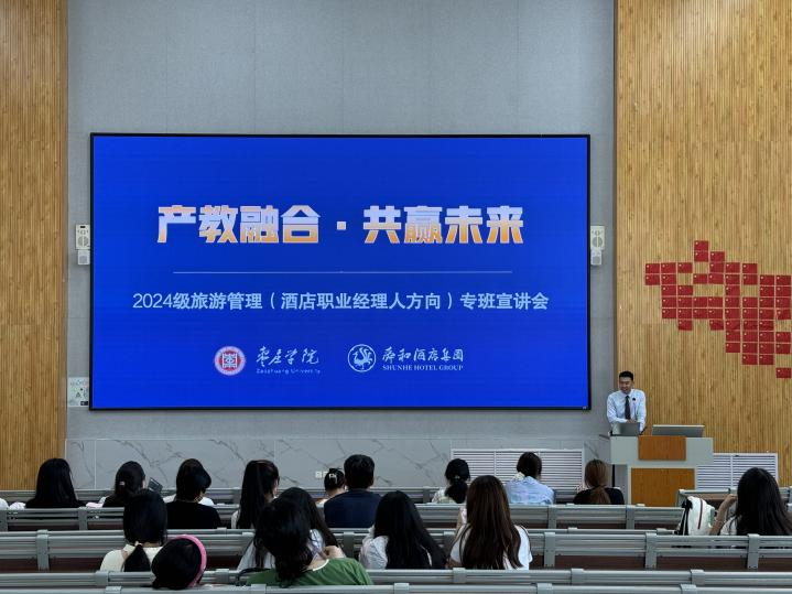 为进一步深化产教融合、校企合作,深入推进校企双主体育人实践,创新工学结合、知行合一的人才培养模式改革,9月19日上午,beat365在线唯一官网和山东舜和酒店集团有限公司在增信楼113举办了旅游管理(酒店职业经理人方向)班宣讲活动。本次活动由副院长孙盼盼主持,山东舜和酒店集团副总裁白璐、行政人资执行总监李林、人才开发部经理刘康主讲,2024级旅游管理专科专业新生及家长参加。