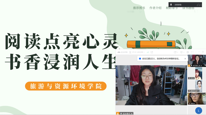 本次活动采取线上线下融合的多元模式,充分发挥学生干部示范引领作用。线上环节依托新媒体平台,学生干部通过制作系列微视频、开展线上会议等同学们喜闻乐见的创意形式,搭建起线上阅读交流的桥梁,推动纸屏共读,有效激发同学们的阅读兴趣。在线下活动中,学生干部通过好书推荐、文学讨论、感悟分享等形式,将一本本经典佳作带到同学们面前,引导同学们在诗词典籍中筑牢文化根基。同学们一致表示,今后将秉持“多读书、读好书”的理念,持续充实自我,提升综合素质,让阅读成为一种生活方式,用知识的力量照亮前行的道路。