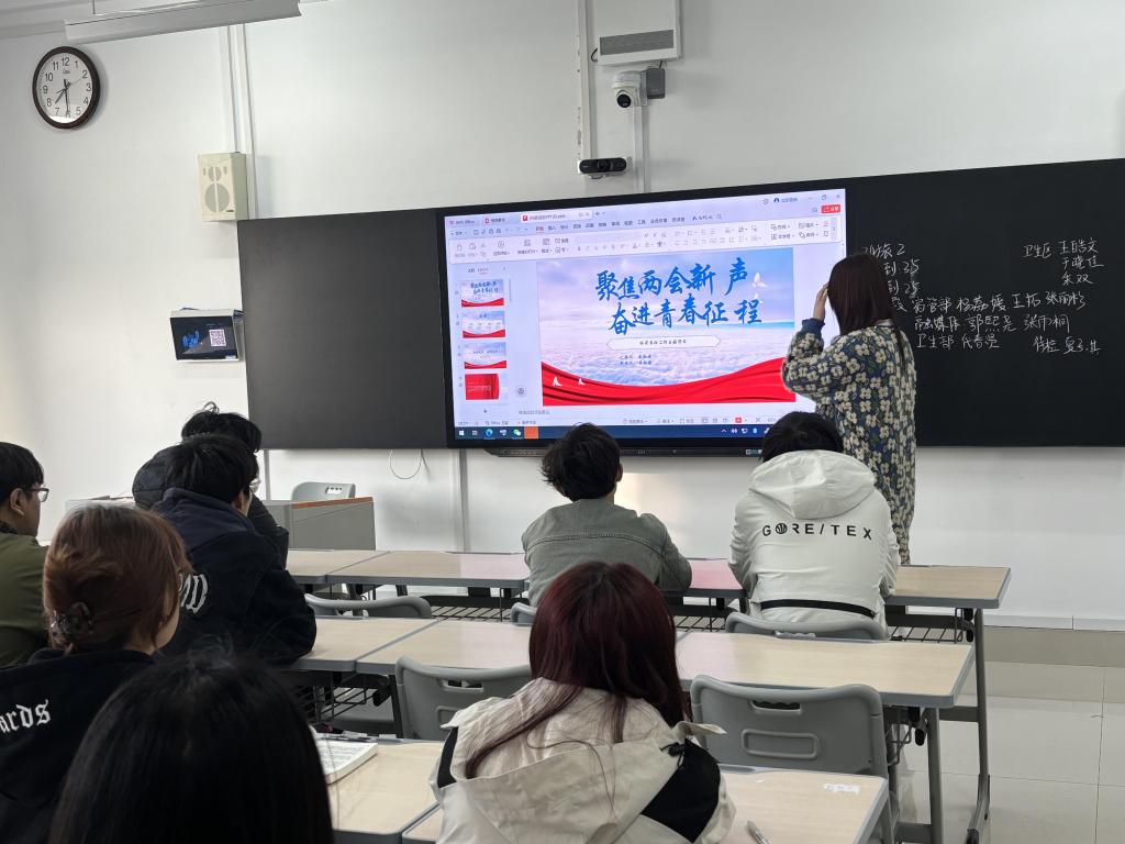 活动伊始,主讲人结合PPT,围绕两会的基本概况、政府工作报告中的关键要点,向同学们详细解读两会的主要内容和重要意义。随后,主讲人从经济发展目标的设定、民生保障措施的推进、科技创新的突破以及生态环境保护的强化等方面进行深入讲解,帮助同学们全面了解国家在各领域的战略布局和发展方向。在交流互动环节,同学们积极参与讨论,结合自身专业特点和未来发展方向,分享对两会精神的理解和感悟。同学们的发言既有对宏观政策的深刻思考,又有对微观实践的创新建议,充分展现出新时代青年将个人理想融入国家发展的责任担当。最后,主讲人激励同学们将两会精神转化为实际行动,努力学习专业知识,提高综合素质,在新时代新征程中书写属于青年一代的奋斗篇章。