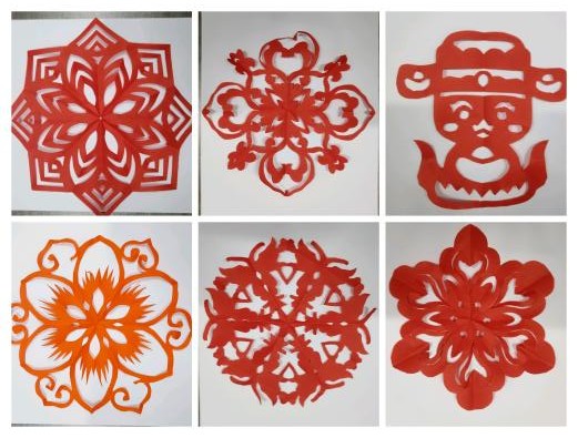 活动现场,由主持人首先为大家讲解了剪纸的历史渊源,演示了折纸、构图、下刀等关键步骤。在互帮互助下,同学们逐渐掌握了剪纸基本技巧,沉浸在剪纸创作的乐趣中。他们手持红纸与剪刀,精心创作“爱心”样字、窗花、等主题作品。薄薄红纸在指尖翻转,剪刀游走间,一幅幅生动的图案逐渐成型。在作品展示与交流环节,同学们讲解展示自己的劳动成果,各式各样的剪纸作品琳琅满目,每一件都蕴含着创作者的心血和创意。