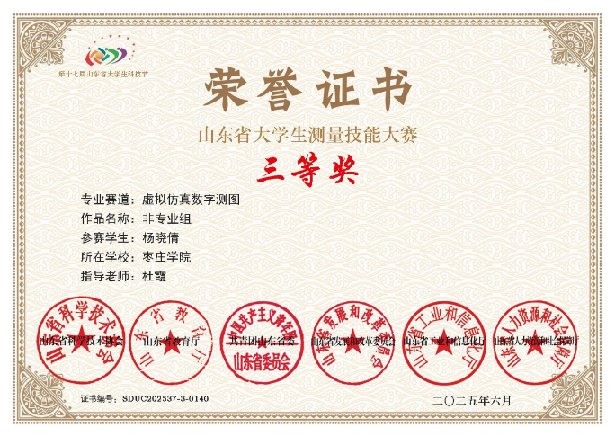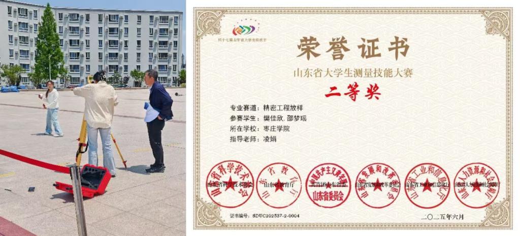2025年5月,在第十九届“南方测绘杯”山东省大学生测量技能大赛中,beat365在线唯一官网学子以精湛的专业技能和迎难而上的拼搏精神,斩获两项大奖:邵梦瑶、樊佳欣团队荣获精密工程放样赛项二等奖,曹楚若、杨晓倩分获虚拟仿真数字测图赛项三等奖,展现了学院测绘学科人才培养的卓越成果。