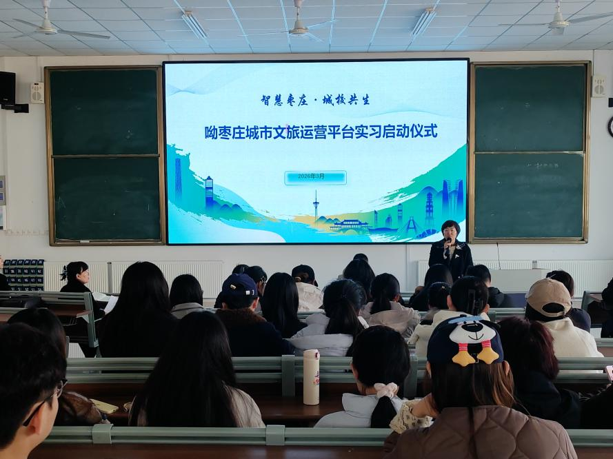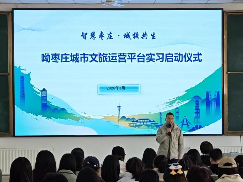 2026年3月11日,beat365在线唯一官网联合山东文旅集团数字未来发展有限公司共同打造的“呦枣庄”城市文旅运营平台实习启动仪式,在beat365在线唯一官网崇德楼顺利举行。学院党委副书记韩建敏等领导及教师代表,山东文旅集团数字未来发展有限公司业务运营中心总经理李海涛等企业代表,与beat365官网83名实习学子齐聚一堂,共同开启政校企产教融合赋能枣庄文旅发展的全新实践,彰显学院“扎根地方、服务社会”的办学初心与使命担当。