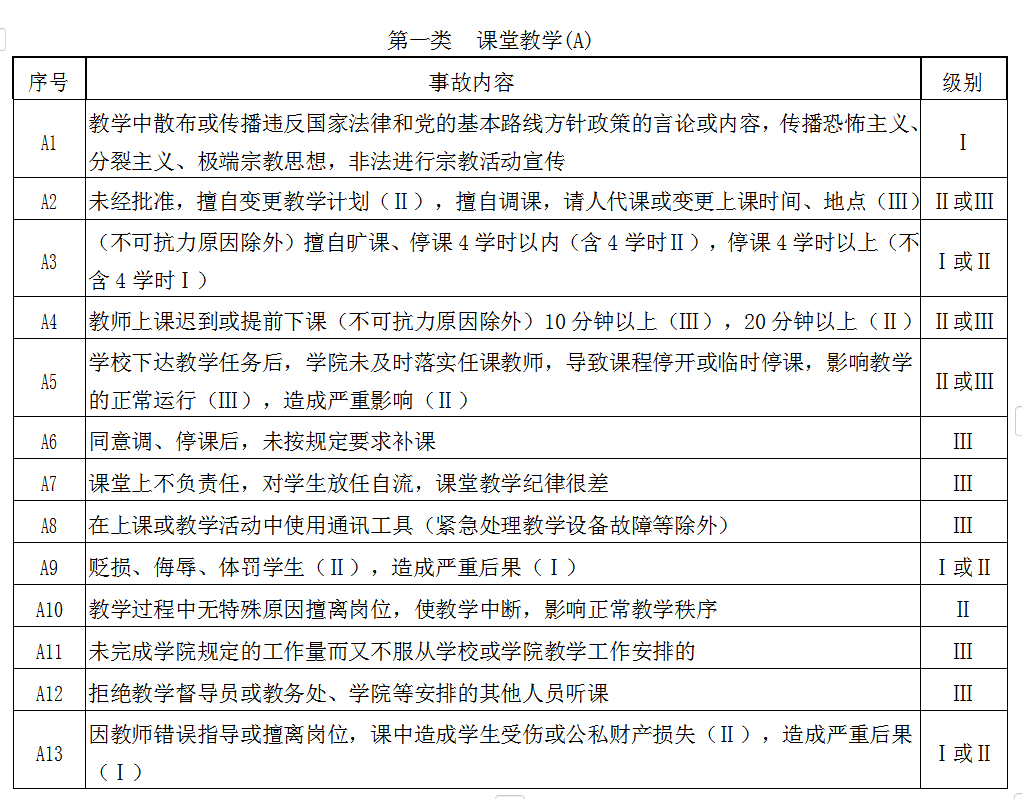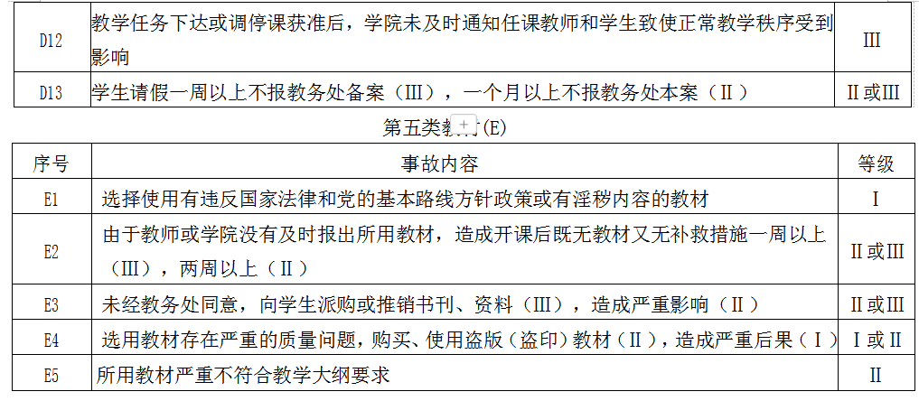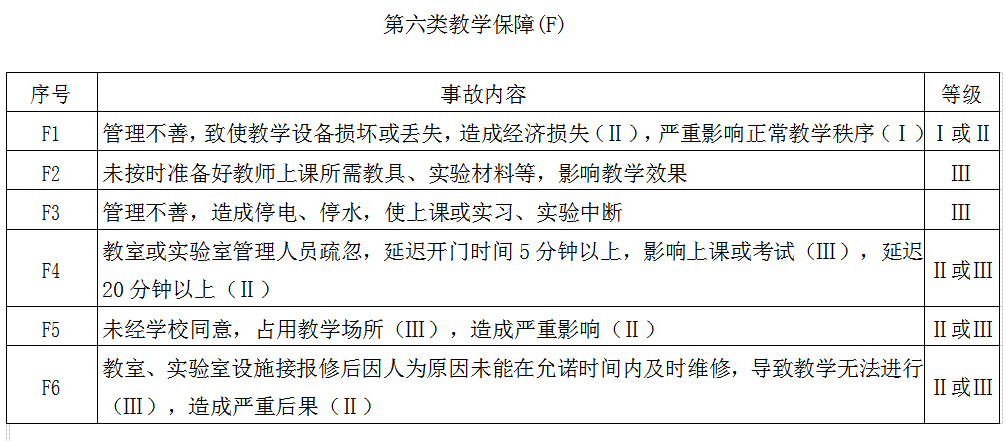 第五条教学事故依据教学与管理等不同环节分为课堂教学(A)、实践教学(B)、考试与成绩管理(C)、教学管理工作(D)、教材(E)、教学保障(F)六大类。根据事故性质和所造成的影响程度分为三个级别:“Ⅰ级”为重大教学事故,“Ⅱ级”为较大教学事故,“Ⅲ级”为一般教学事故。