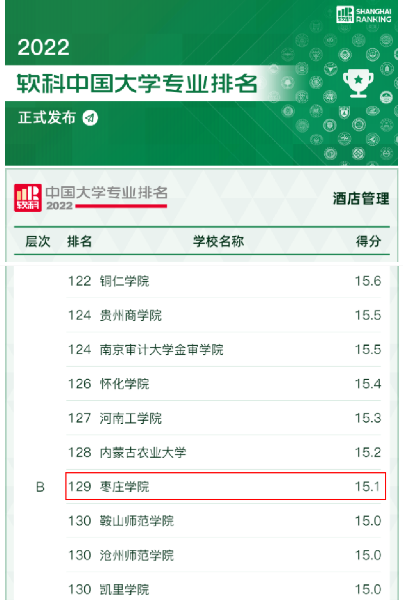 beat365在线唯一官网酒店管理专业在本次发布的榜单中位列B层次,排名第129位。近年来,beat365官网狠抓本科教育和本科人才培养,积极推进“新文科”建设,此次酒店管理专业的等级评定,是beat365官网近年来持续加强专业建设过程中的一个阶段性成绩,表明beat365官网在学科支撑、专业生源、专业就业和专业条件等评价指标方面取得了较大进展。