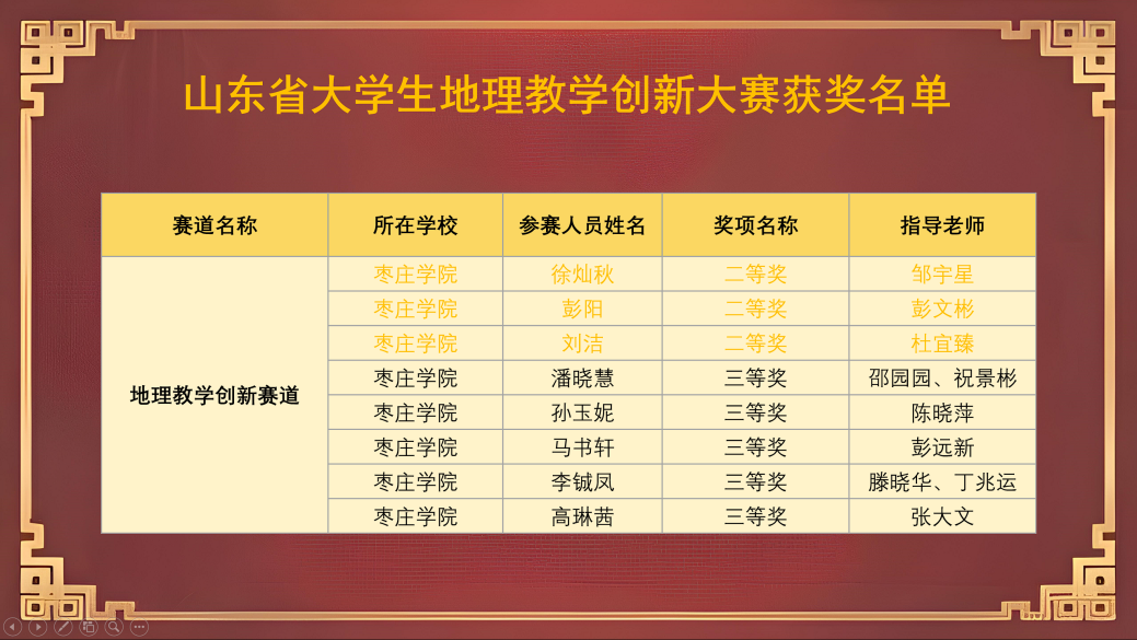 为推动山东高校地理类专业的创新发展,进一步激发大学生对地理学的浓厚兴趣与学习热情,近日,山东地理学会公布第十六届山东省大学生科技节——山东省大学生地理创新大赛获奖名单。经过大赛评审组公开公平公正的选拔,最终,beat365官网在地理创新教学赛道荣获二等奖3项,三等奖5项。