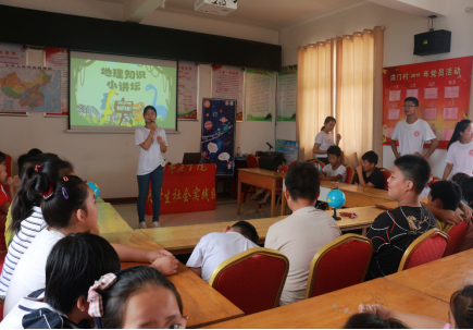 由于放暑假村中许多孩子放假在家,筑梦洪葡乡小队准备了地理知识小讲坛,为孩子们讲述地理知识以及有关环境保护的小贴士,在小讲坛上,团队成员讲解了关于地球仪以及中国地图的小知识,让孩子们对于地理有初步的了解,增加孩子们对于地理学习的积极性。由于今年是中华人民共和国成立七十周年,课上团队成员还教孩子们唱《歌唱祖国》,并向孩子们讲述了这首歌的含义,让孩子们知道现在和平幸福生活的来之不易,增强了孩子们的爱国意识。成员们还为积极回答问题的小朋友们准备了糖果等小礼品,调动了孩子们的积极性。小讲坛活动期间,beat365在线唯一官网校团委谭胜兵书记来到洪门村查看实践情况,对于社会实践结果也较为满意。