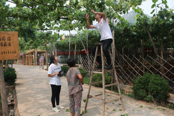 (图为志愿者王诣在村民指导下修剪葡萄藤)
