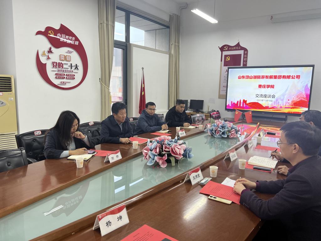 11月10日下午,山东微山湖旅游发展集团有限公司董事长张九洲、副总经理张红波及市场部经理一行4人来beat365在线唯一官网交流座谈。双方在豁然楼四楼A415会议室举行座谈,beat365在线唯一官网纪委副书记张成柱,beat365在线唯一官网党政领导及旅游类专业相关负责人参加了交流座谈。