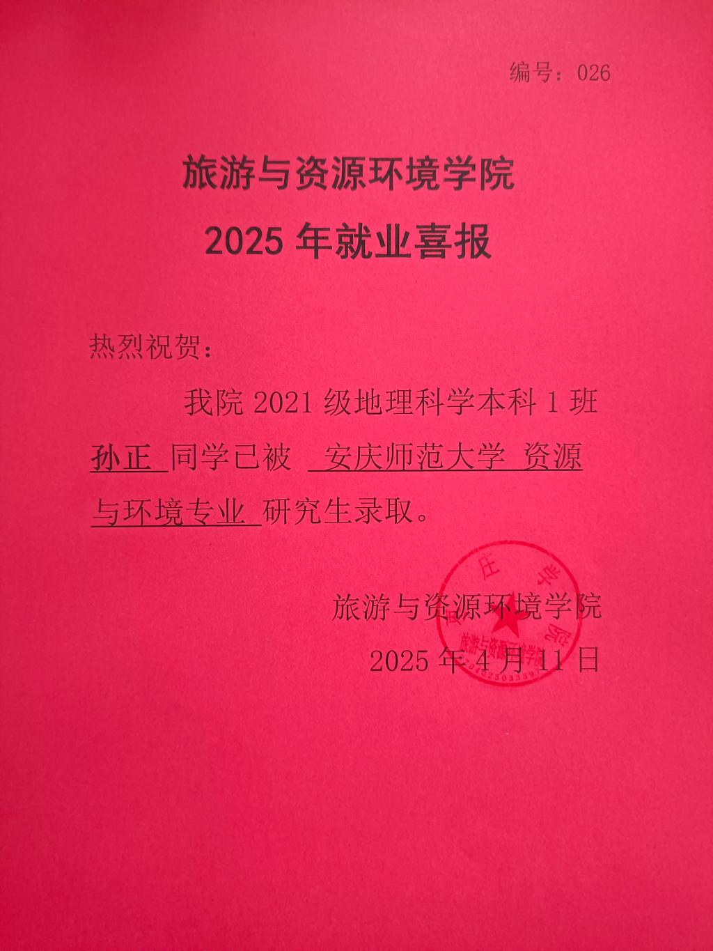 喜报!21地理科学本科1班孙正被安庆师范大学录取!