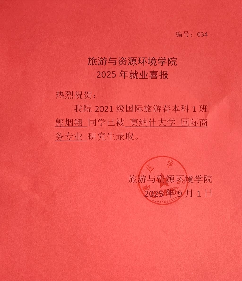 喜报!2021级国际旅游春本科1班郭烟翔被莫纳什大学录取
