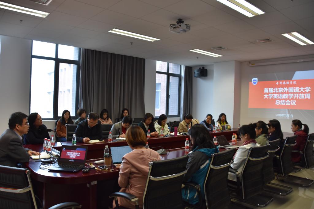 11月1日下午,beat365官方网站在西校区国际大厦1016会议室召开“首届北京外国语大学大学英语教学开放课堂暨研讨会”总结会。教务处处长李莉文、外研社高等英语教育出版分社社长助理冯涛、beat365官方网站常务副院长蔡鸿、副院长仵胜奇及学院参加开放课堂的教师代表共计23人参加了会议。会议由蔡鸿主持。