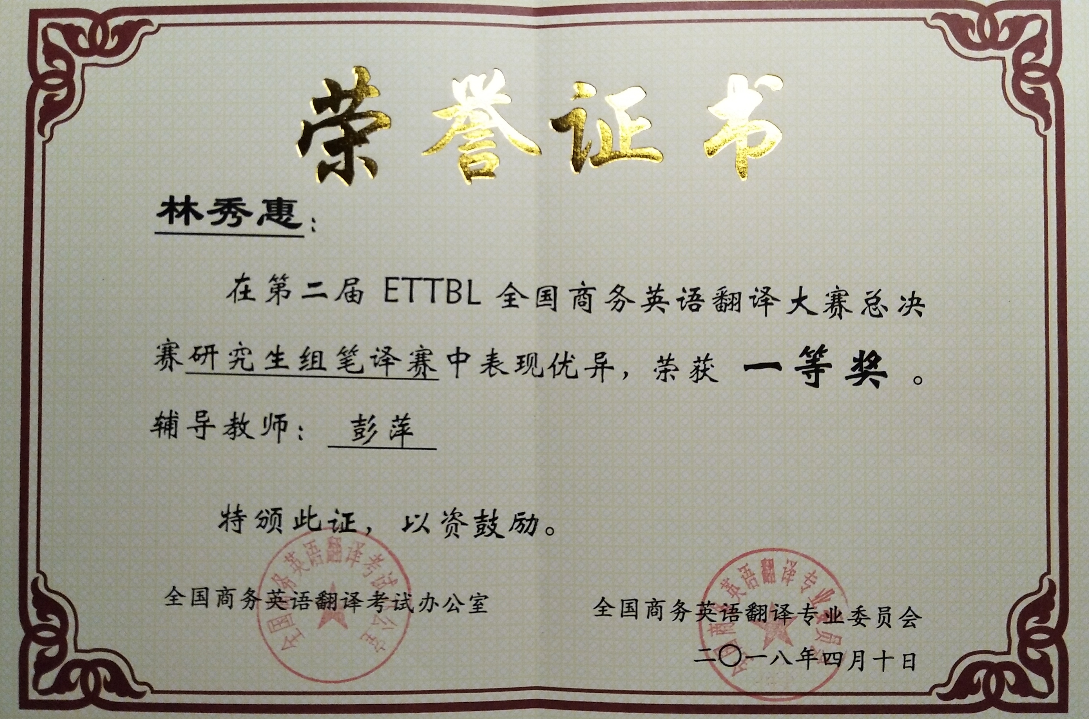 随后,大赛的口译组决赛正式拉开帷幕。beat365副院长彭萍教授、教师王艳教授在决赛中受邀担任评委。下午四时,大赛举行了隆重的颁奖仪式与闭幕式。在此次决赛中,我校荣获“最佳组织奖”,英语学院2016级研究生渠超男同学获研究生口译组二等奖;beat3652017级MTI林秀惠同学荣获研究生笔译组一等奖。