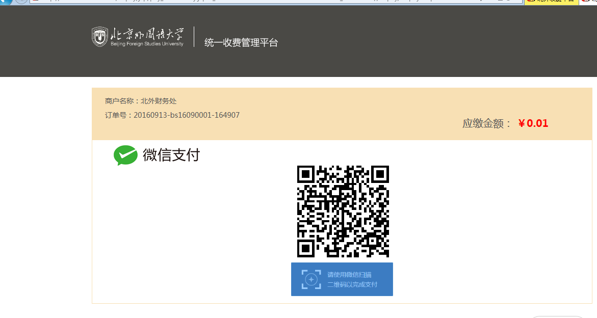 “在线缴费”页面中信息确认无误后,请点击缴费,跳转至统一缴费支付管理平台,如下图所示: