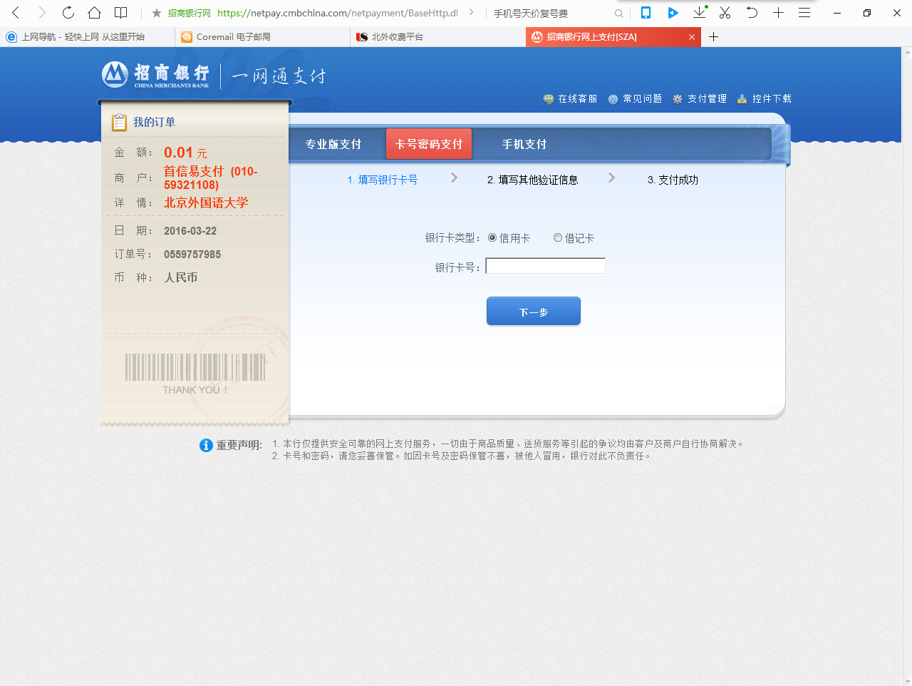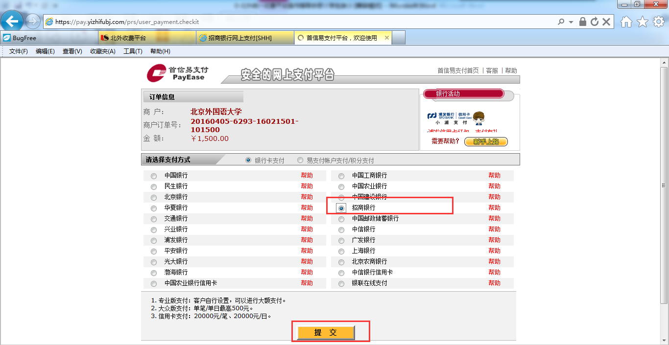 第一步:在弹出的首信易支付平台界面,选择银行卡支付或易支付方式后,此处以招商银行为例,点击【提交】: