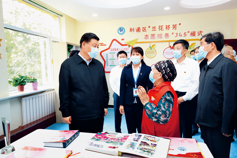 2020年6月8日至10日,中共中央总书记、国家主席、中央军委主席习近平在宁夏考察。这是6月8日下午,习近平在吴忠市利通区金花园社区党群活动服务中心,同社区志愿者代表亲切交谈。新华社记者 鞠鹏/摄