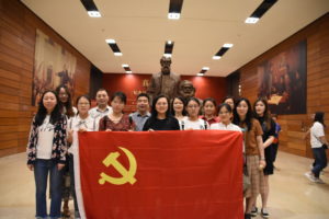 在进入展览大厅前,全体党员怀着无比崇敬的心情首先在马克思恩格斯雕像前合影留念,随后,李莉文书记做了简短的讲话,要求全体党员借此机会认真参观展览作品,细细品味真理力量,了解马克思的生平、革命实践、理论贡献和精神境界并把所学所感自觉落实到今后的行动中。接着,李莉文书记又专门对学生党员做了讲话,希望他们能够借此机会认真学习马克思主义思想,结合语言学习的优势用英语对外讲好马克思主义思想,把马克思主义和中国的具体实践结合起来,在新时代听党的话,自觉肩负起中国文化传播出去的历史使命,讲好中国故事,做好传播中华文化的实践者。